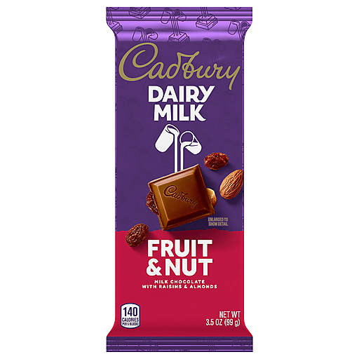 Creamy, chewy and crunchy, CADBURY DAIRY MILK fruit and nut chocolate candy bars are a snack you'll immediately reach for when you want to indulge in a delicious, velvety smooth milk chocolate treat. Take a break from adulting and enjoy a few pieces straight out of the wrapper. With this milk chocolate, fruit and nut candy, you can even think about adding a special touch to your baking prep by topping cookies, cupcakes and brownies. You can also use CADBURY chocolate to create a delicious, melty treat. Carefully melt the CADBURY chocolate, then dip, dunk, drizzle and swirl it over sweet and salty snacks, including pretzels, fruit, marshmallows, assorted nuts and just about every other treat you can think of. Take a CADBURY DAIRY MILK chocolate bar to work for a midday treat to share with your co-workers or add some to gift baskets to share the timeless taste of milk chocolate and the extra crunch and chew of raisins and nuts. These candies also make unique chocolate gifts during Valentine's Day, basket fillers at Easter, stocking stuffers throughout the holidays and Halloween treats during trick-or-treat season. Get ready to please the crowd whether you're celebrating a holiday or just enjoying an ordinary sharing moment with CADBURY chocolate candy you'll swear tastes better with every bite.