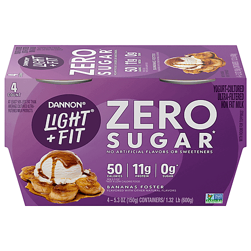 Looking for a delicious nonfat dairy product made with 0 grams of sugar* and a delightful bananas Foster taste you’ll love? Treat yourself to fierce flavor when you open a Dannon Light + Fit Zero Sugar* Bananas Foster snack cup from this four pack. Every bite will make you love this nonfat product from this delicious light yogurt brand.** Light + Fit Zero Sugar* is made with nonfat milk that’s been ultra-filtered to remove the sugar in dairy, leaving a rich and creamy snack with great taste. Plus, you can feel good with every spoonful because it contains no artificial sweeteners or flavors. Balance your active lifestyle with 11g of high-quality protein and 50 calories per individual 5.3 oz serving. It’s a deliciously sweet, creamy product to enjoy as a snack and as a fat free dessert that will satisfy your tastebuds – just add your favorite toppings to make it your own! Grab an individual snack cup for a treat after the gym, for a rich, creamy addition to your lunch or for zero sugar* desserts. Plus, you can craft your own protein shakes and smoothies with this zero sugar* fat free product as a key ingredient. Dig into deliciousness every time you crack open a Dannon Light + Fit Zero Sugar Bananas Foster snack cup – a zero sugar* offering that doesn’t compromise on taste. *Not a low calorie food. **At least 50% less fat than average cultured ultra-filtered milk products; Light & Fit: 50 calories, 0g fat; Average cultured ultra-filtered milk products: 80 calories, 2.5g fat per 5.3 oz.