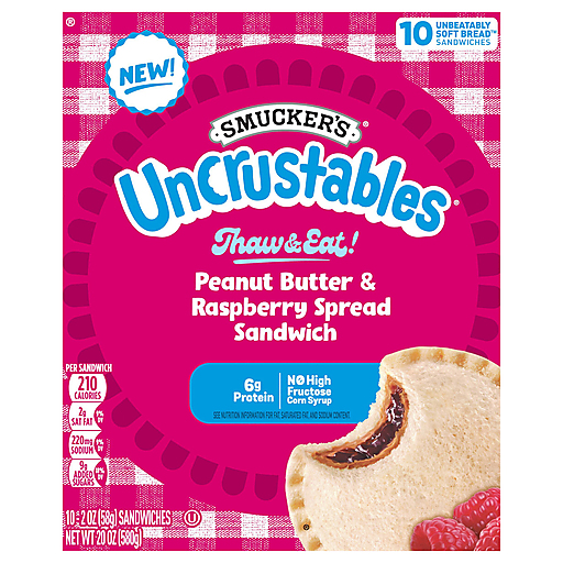 Make busy days more doable with Smucker’s Uncrustables frozen sandwiches — the easiest kid-approved snack and lunch food ever. This box contains ten individually wrapped sandwiches. Just grab one from the freezer in the morning, and it's thawed and ready to make your kid's day by lunchtime. No fuss. No crust. It’s just The Best Part of the Sandwich, with the yummiest tastes and textures. The outside of an Uncrustables Peanut Butter & Raspberry Spread Sandwich is Unbeatably Soft Bread Baked Fresh in the USA, and the inside is packed with creamy peanut butter and smooth, sweet raspberry spread. An unbeatable combo, with no high-fructose corn syrup, and no artificial sweeteners or colors. Basically, these super-convenient snacks and lunch foods provide the ultimate PB&J experience. Try ’em all! There’s a kid-friendly flavor for every day of the school week.